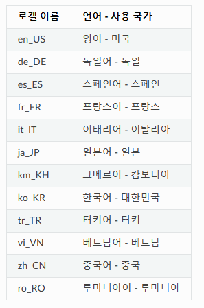 전체 사용가능한 로케일은 아래 표를 참고하실 수 있습니다.