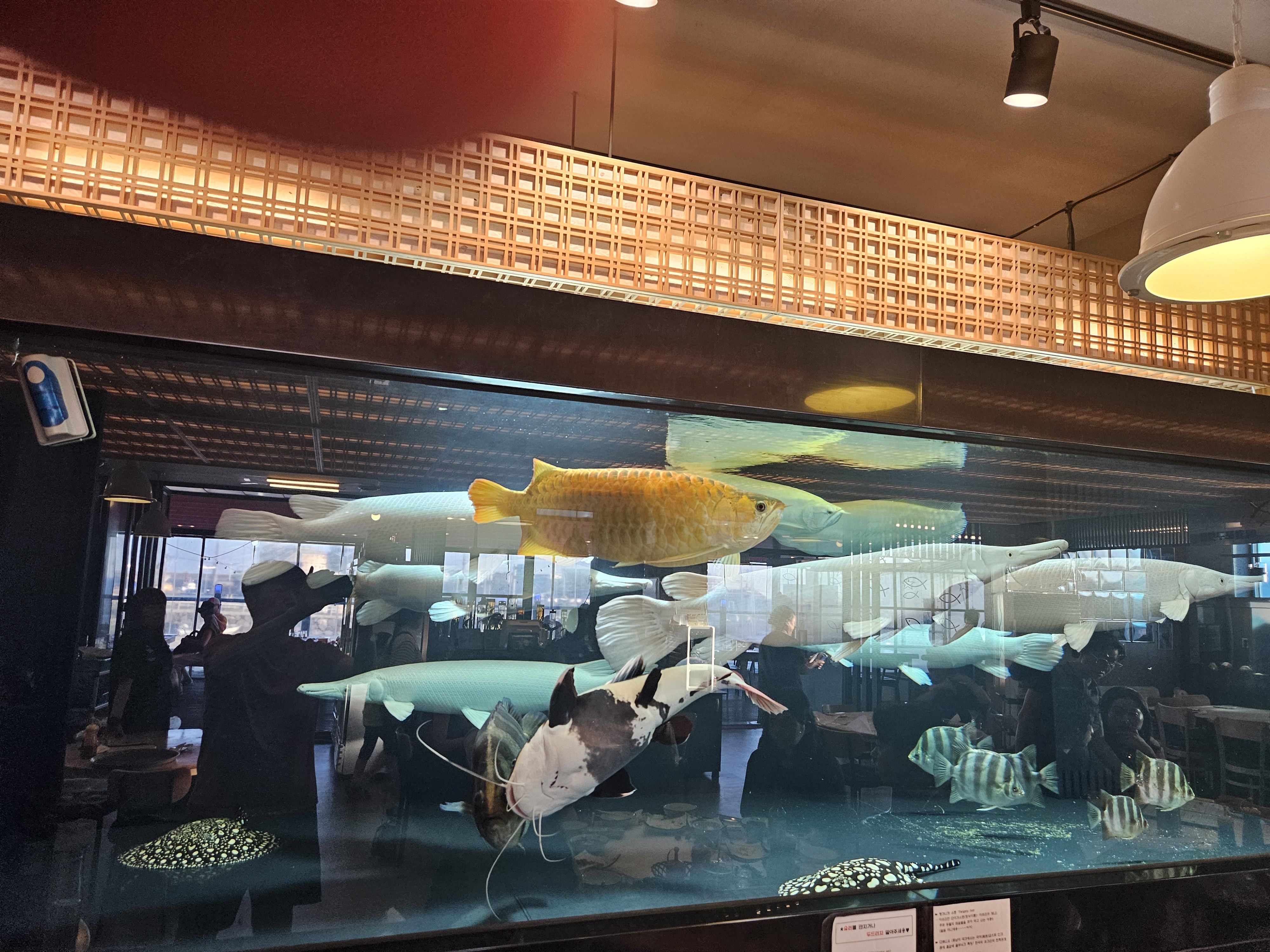 도착해서 아이들과 가게 내부에 있는 수족관을 구경했습니다. 수족관에는 신기한 물고기들이 많아서 아이들이 재미있게 봤습니다.