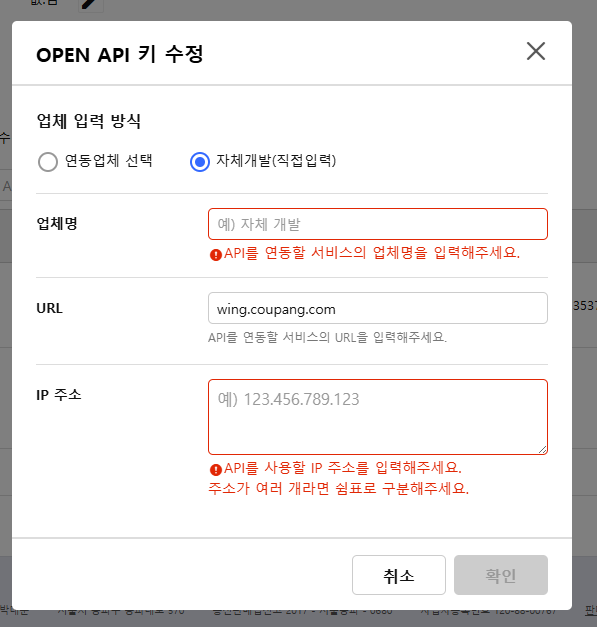 OPEN API를 발급 받으면 업체를 입력해야하는데, "판매자정보 > 추가판매정보"로 이동해서 OPEN API 키 수정 항목을 눌러서 "자체개발"을 입력해 주시면 됩니다.