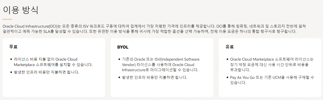 오라클 클라우드 인프라(OCI: Oracle Cloud Infrastructure)는 ISV(Independent Software Vendor)의 소프트웨어 구동에 대해서 세 가지 방식을 제공합니다.
