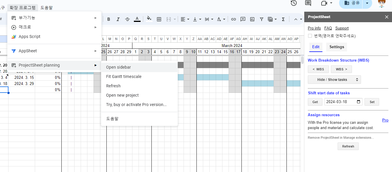 아래와 같이 확장프로그램 > ProjectSheet planning > Open new project를 누르면 신규 프로젝트 시트가 생성됩니다.