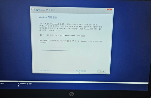 윈도우 11 설치 중에 정품 인증 제품 키를 받는 화면이 나옵니다. 제품 키가 있으신 분들은 여기서 제품 키를 넣으시면 됩니다. 하지만, 제품 키가 없는 분들은 "제품 키가 없음"을 누르시고 그냥 넘어가시면 문제없이 설치를 하실 수 있으니 걱정하지 마시고 "제품 키가 없음"을 누르시면 됩니다. 설치 먼저 하시고 사용하시면서 라이선스를 입력하시거나 라이선스 서버에 접속하여 인증을 추후에 받으실 수 있습니다. 그리고, 만약 라이선스 인증을 받지 못하더라도 갑자기 사용을 못하게 되거나 하는 일은 없습니다. 다만, 우측 하단에 정품 인증 안내 메시지가 지속적으로 나타날 수 있습니다.