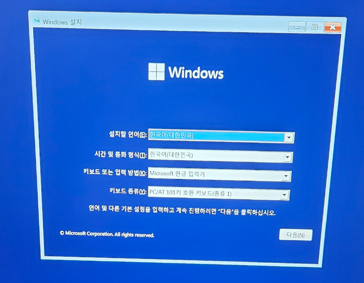 이 화면에서는 기본적으로 언어 및 시간 키보드 등을 선택하실 수 있는데 이상 없는지만 확인 후 다음을 누르시면 됩니다.