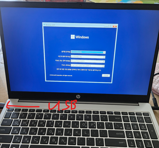 만약 USB를 제거하지 않으면 USB로 부팅이 되어버려서 윈도우를 처음부터 다시 설치하는 화면으로 진입하게 됩니다.