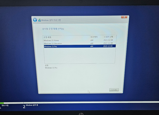다음으로 윈도우 11의 종류를 선택하는 화면이 나타납니다. 윈도우 11은 Home, Education, Pro로 나뉩니다.