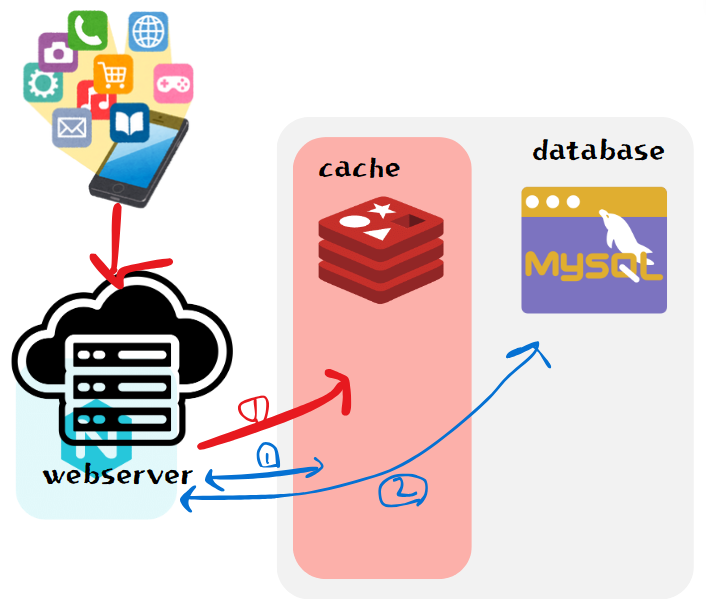 아래 그림은 웹 서버가 app으로 부터 요청을 받아 데이터를 redis cache 혹은 database에서 가져오는 것을 보여줍니다.