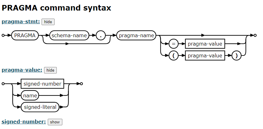 - 일부 PRAGMA는 실행 단계가 아닌 SQL 컴파일 단계에서 적용됩니다. 즉, C언어의 sqlite3_prepare(), sqlite3_step(), sqlite3_finalize() API(또는 이와 유사한 래퍼 인터페이스)를 사용하는 경우 일반 SQL 문처럼 sqlite3_step() 호출이 아닌 sqlite3_prepare() 호출 중에 프래그마가 실행될 수 있습니다. 또는 일반 SQL 문처럼 sqlite3_step() 중에 프래그마가 실행될 수도 있습니다. 프래그마가 sqlite3_prepare() 또는 sqlite3_step() 중에 실행되는지 여부는 프래그마 및 특정 SQLite 릴리스에 따라 다릅니다.