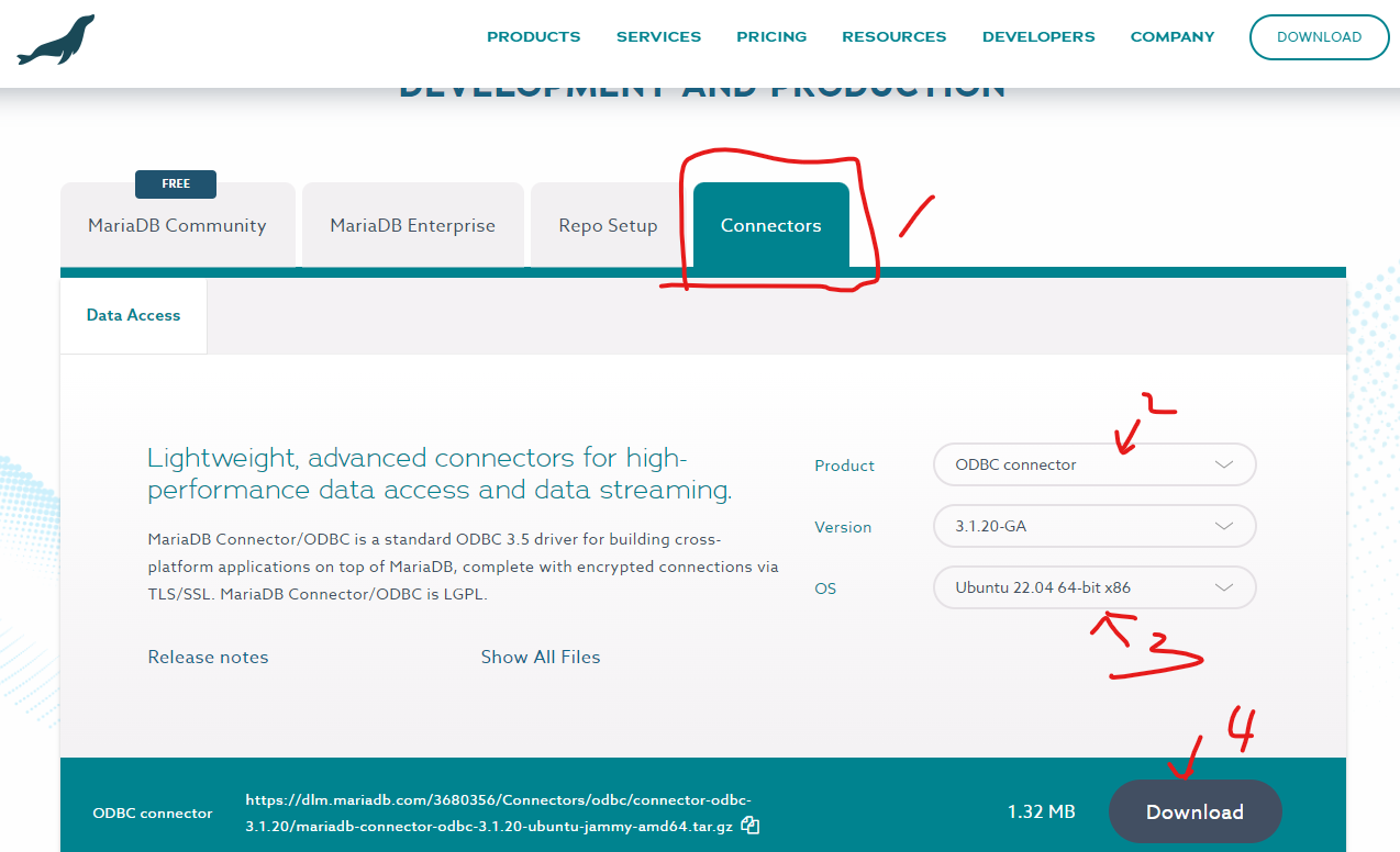 먼저 MariaDB Connector/ODBC download page로 가서 원하는 버전의 Tarball을 다운받아야 합니다.